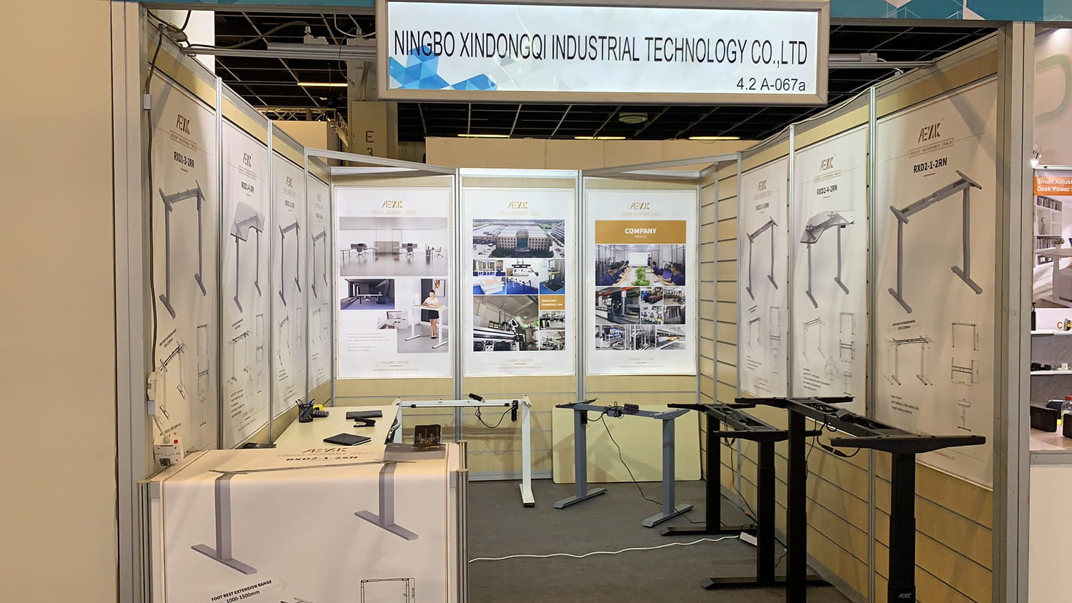 Título: Exposição em Colônia/Alemanha, apresentando as mais recentes mesas de pé com motor único e motor duplo. Personalizações são bem-vindas.